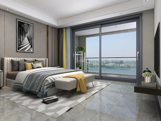 窄勾企設計,躺在床上,就能一覽門外江景,這就是臥室陽臺安裝推拉門的魅力,將私密空間與開放空間隔斷,滿足空間功能劃分和隔音效果的雙重需求。經典的灰調門框,彰顯設計的時尚感與品質感。灰與黃的交融布局,兼顧摩登的同時又讓人感覺到溫馨。