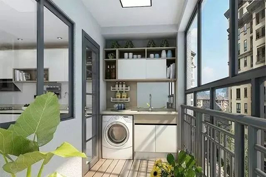 陽臺除了放置洗衣機外,可以再定制收納柜放置雜物,還可以擺些桌椅,種些花草,除了與客廳的聯動性較差,整體實用度還是非常高的。