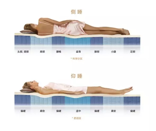 改變了傳統床墊分區,根據人體睡在床墊上各個不同的著力點,推出更多配合頭、肩、背、腰、臀、腿、腳七個部位不同著力要求而設計的七區床墊,讓床墊更符合人體曲線,給喜歡變換不同睡姿的人提供恰到好處的支撐,更好地緩解肌肉緊張,讓睡眠更加舒適。