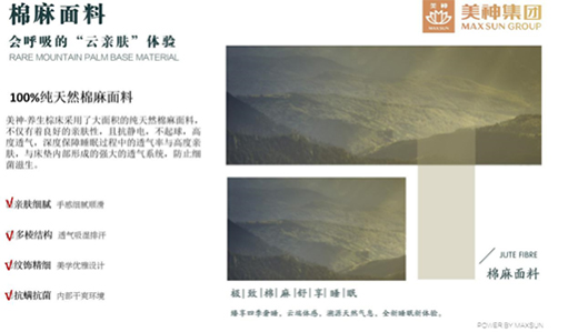 人們睡眠問題的突出,消費者逐漸形成新的睡眠剛需!除了常規的睡眠材料:乳膠、彈簧、棕等,美神應用了更多的天然環保創新材料 ,不僅對護脊睡眠有優質的體現,對舒適度的提升也有良好的體驗!天然棉麻、竹炭山棕、金絲麻棕 等復合型天然材料也是美神2020新品的一大亮點!