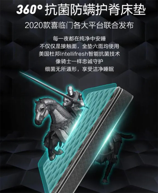 2020年,喜臨門全新推出抗菌防螨系列床墊,喜臨門城市愛情京東旗艦店同步上新抗菌防螨床墊。該系列床墊采用美國杜邦抗菌和瑞士山寧泰防螨雙核技術,凈護您的健康睡眠。