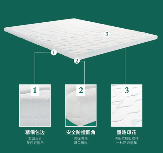 在材料上,米拉床墊采用高純度天然乳膠與親膚透氣針織面布。天然乳膠強韌硬彈,護脊硬而不僵,耐用不易塌陷,還能抑菌防螨,創造安心睡眠;親膚透氣針織面布質感如云柔般舒滑,能夠有效吸濕排汗,締造透氣清爽睡感。在外形上,米拉加硬護脊兒童乳膠床墊采用清新竹蜻蜓紋樣的童趣印花,配上精細包邊、圓角設計,不僅能避免磕碰,還美觀耐用。