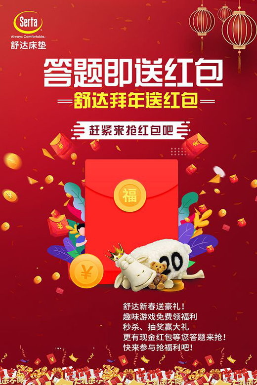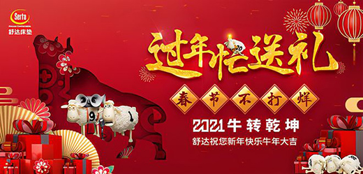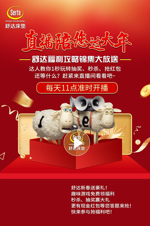線上直播陪您過大年、秒殺、免費抽獎、驚喜折扣、答題搶紅包、枕頭游戲等一系列鉅惠活動砸來,舒達玩出了牛年Style,將一場周年春節優惠活動,做成了全民狂歡!