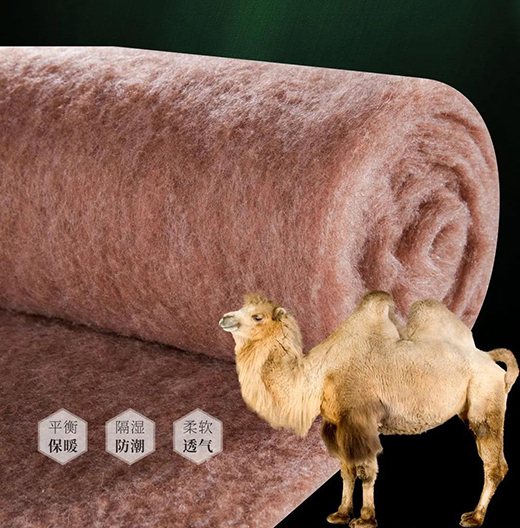 駱駝毛主要是指取自雙峰駝身上的毛纖維,顏色從乳白色至棕褐色,其中色淺的、光澤好的駱駝毛品質優良。駱駝毛是比較理想的保暖材料,有分量輕、易洗滌、保暖性好等優勢,可以用來織造棉衣、棉褲或者作為填充物做成被褥。