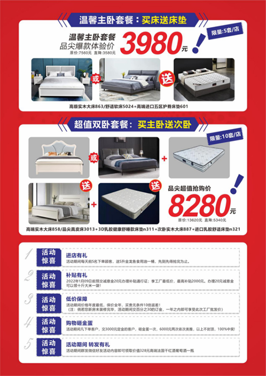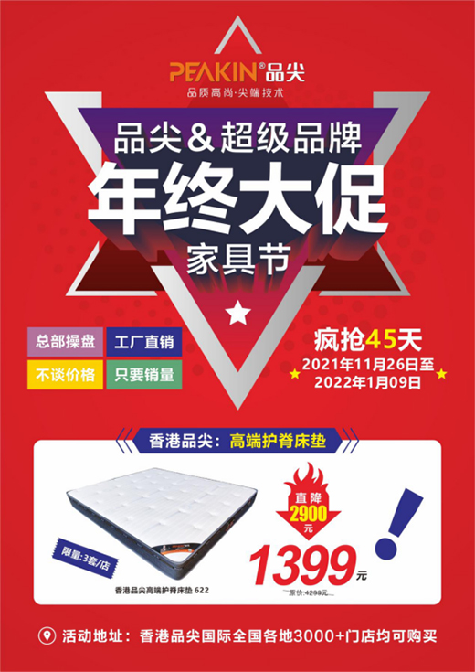 在2021年的尾聲,品尖家具特推出“品尖&超級品牌年終大促家具節(jié)”暖心福利活動。忙碌了一年的您,除了忙著工作,也要記得給自己一張好床墊,讓身心得到放松。品尖床墊以科學(xué)設(shè)計改善睡眠狀況,助力舒睡一整晚,讓一天的疲憊在甜美的睡夢中得到治愈。
