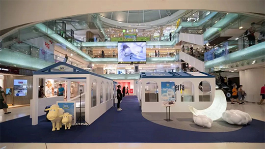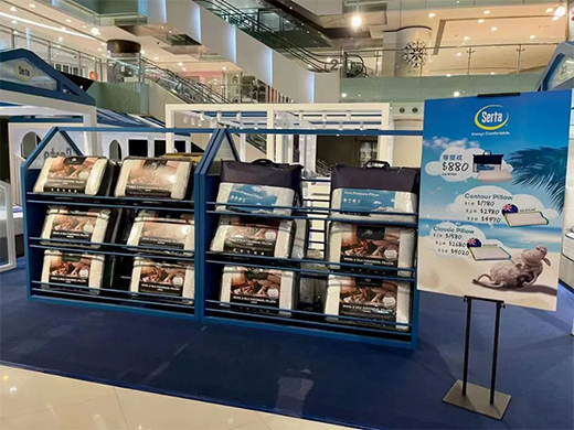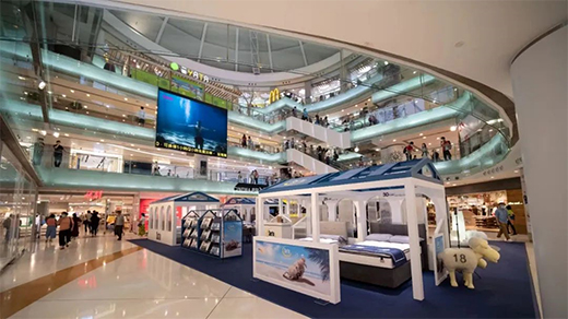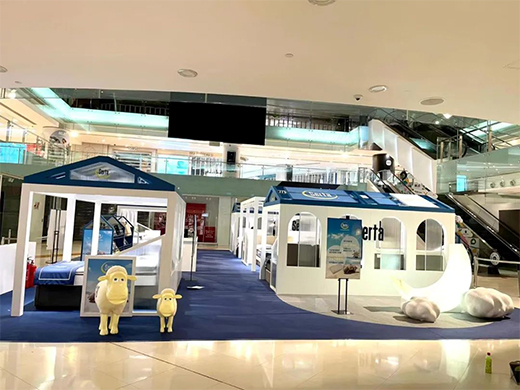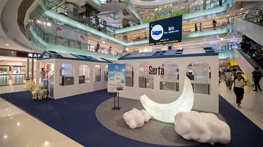 這是舒達(dá)床墊的快閃店,于6月24日搭建完成。次日是周末,很多客戶全家逛商場時都走進(jìn)來看一看。