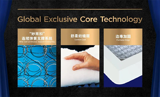 舒達(dá)一直以“制造舒適的床墊”為使命,其三大核心技術(shù)【妙而扣連續(xù)彈簧系統(tǒng)、舒柔絎縫層、邊緣加固系統(tǒng)】,讓床墊更具支撐性、舒適性、耐久性。