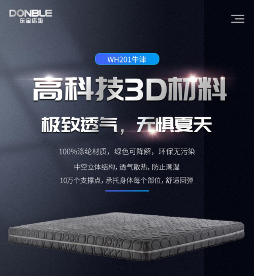 市場上大多數床墊均使用乳膠、海綿等多層材料填充,而東寶床墊牛津使用3D材料填充,透氣性更好。3D材料具有360°透氣的中空立體結構,使床墊內部空氣與外界空氣流通,加快熱量的散發,為我們保持一個舒適的睡眠環境。