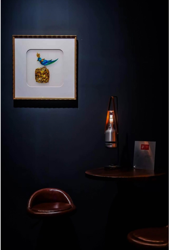 展位同時呈現夢與夢藝術中心帶來的刺繡作品《石上鳥》《日出》,由藝術家刁娟創作,以天然桑蠶絲為媒,在燈光映照下展現出寶石般的光澤與火彩。