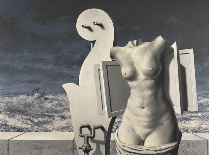 《飛翔的雕像》(La Statue volante,估價:900萬至1200萬英鎊)是馬格利特創作生涯最后十年間最謎樣的畫作之一。馬格利特聚焦于兩個核心元素:經典的米羅的維納斯雕像與一段建筑飾條雕刻,并將兩者戲劇性地放大與裁切。