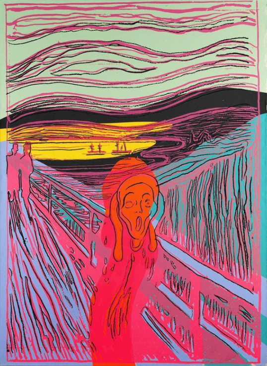 本次拍賣將釋出四幅沃荷的重要畫作。拍賣重點之一是兩件受愛德華?孟克(Edvard Munch)啟發的作品——孟克與馬蒂斯(Henri Matisse)是沃荷最喜愛的藝術家:《圣母與帶骷髏手的自畫像(致敬孟克)》(Madonna and Self-Portrait with Skeleton’s Arm (After Munch),估價:150萬至200萬英鎊),以及《吶喊(致敬孟克)》(The Scream (After Munch),估價:200萬至300萬英鎊)。這些作品出自沃荷的《取法藝術》(Art from Art)系列,他在這一系列中,透過其標志性的普普風格重新演繹藝術史上最廣為人知、最具代表性的經典圖像——從波提切利的《維納斯的誕生》到達文西的《最后的晚餐》——創作出帶有鮮明個人風格的作品。