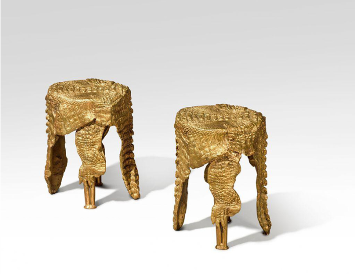在為保琳量身打造的眾多作品中,最為獨特的莫過于克洛德所創作的《鱷魚凳》(Crocodile Stools,估價:18萬至25萬英鎊)——這是在市場上前所未見的款式。《鱷魚》系列的誕生與作品本身一樣充滿超現實色彩。1972年的一個滿月之夜,得力于藝術家妮基?桑?法勒(Niki de Saint Phalle)與動物園園長的關系,萊蘭在午夜前往當地動物園,取得一只剛死的鱷魚。