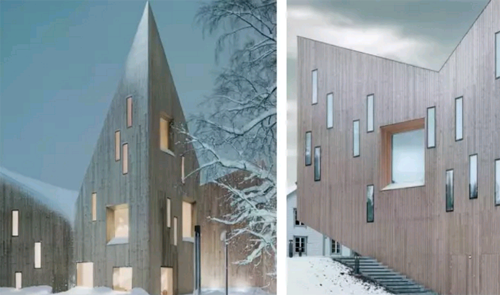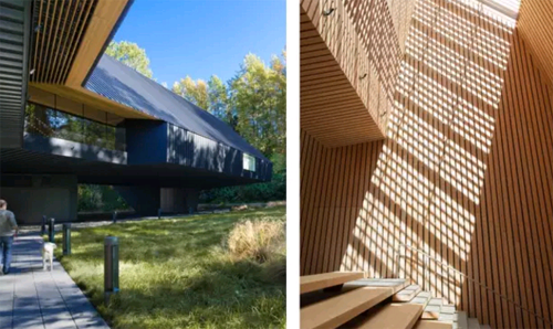 建筑外表皮開口處黑色金屬表皮被明亮的木框包裹著