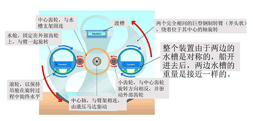 這一對(duì)大轉(zhuǎn)輪,轉(zhuǎn)輪兩邊各有一個(gè)對(duì)稱的可封閉水槽,當(dāng)輪船要由高水位運(yùn)河開往低水位的運(yùn)河時(shí),先由高架水渠開入水槽內(nèi),然后把水槽封閉,接著大轉(zhuǎn)輪緩慢旋轉(zhuǎn)半圈,封閉水槽和輪子之間的齒輪運(yùn)轉(zhuǎn),平穩(wěn)地把水槽里的船只運(yùn)送到低水位的河道里,再從人工河進(jìn)入到運(yùn)河里。