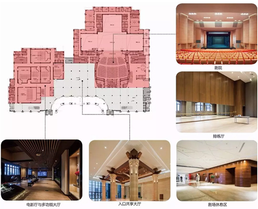 建筑布局呈東西朝向,共分為3大功能區(qū):中區(qū)為入口共享大廳,北區(qū)為劇院及排練廳,南區(qū)為影廳與多功能大廳。建筑內部還設置了餐飲、精品店、咖啡廳、展廳等商業(yè)文化設施。這是一座功能復雜、規(guī)模宏大的綜合文化中心。
