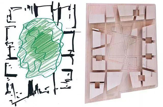 最后的設(shè)計(jì)稿里,17座單體建筑形成一個(gè)圍合,屋頂上將會(huì)種滿(mǎn)茶樹(shù),如同“蘋(píng)果”的果皮。
