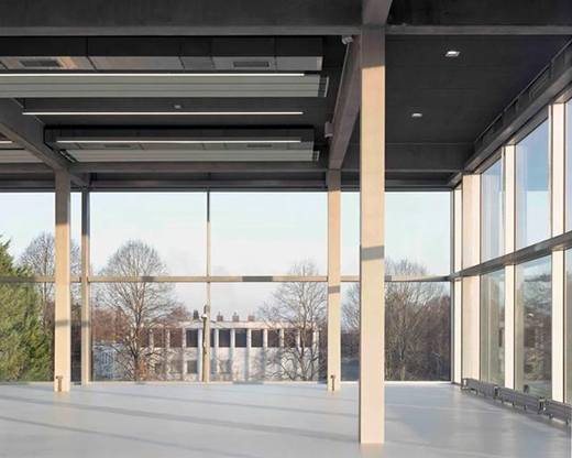 項目用材建筑的主要材料是玻璃和混凝土。玻璃幕墻中嵌入了三軌大型鋁合金推拉門,顯得十分特別?;炷亮侯A先澆筑在工業模具中,而混凝土柱則是現場澆筑的。