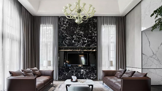 門廳正對著的是空間開闊、窗明幾凈的會客廳。沉穩的皮質沙發搭配質地清晰的大理石背景墻,地毯柔和的紋路綜合了空間的剛硬,與淡綠色透明吊燈一起,為空間增添了幾分活力。陽光透過柔紗窗簾輕拂在會客廳內,賓客與屋主得以細語交談,賓主盡歡。