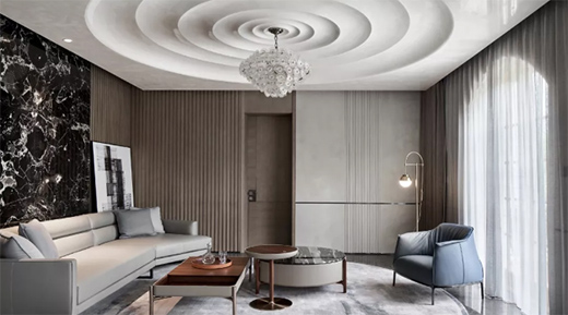緊鄰會客廳的,是悠閑舒怡的起居室。水滴漣漪般的吊頂讓空間產生靈動的氣息,永恒與美好在此波蕩而開。地毯和茶幾的幾何形搭配平衡了空間,也使之層次更為多樣,別具一格。