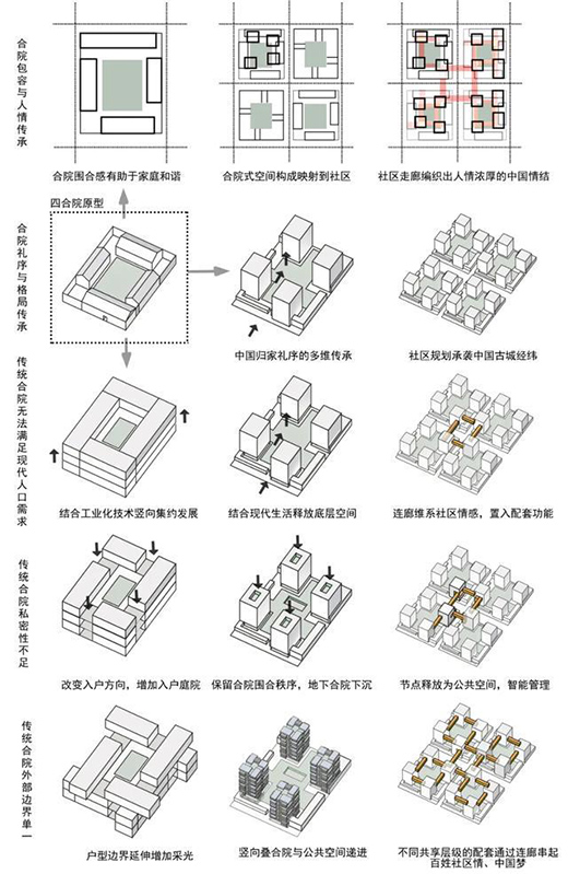 以此背景,設計從追溯到暢想,從傳統走向未來,珍惜中國傳統合院形式帶來的人情溫暖,將其不適應現代生活的空間重構,以此打造一個智慧共享、生態共生、全齡共樂、產城融合的“合樂”社區。