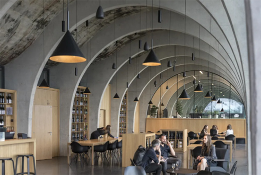 這個看起來略帶奇幻色彩的室內設計是為了呼應當地的地形和建筑傳統,設計師特意模仿了當地特有的拱形酒窖造型,通過拱形柱廊空間的設置,打造出奇特的曲線美!