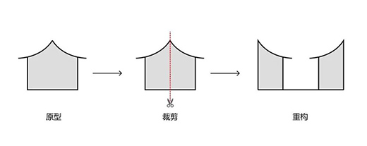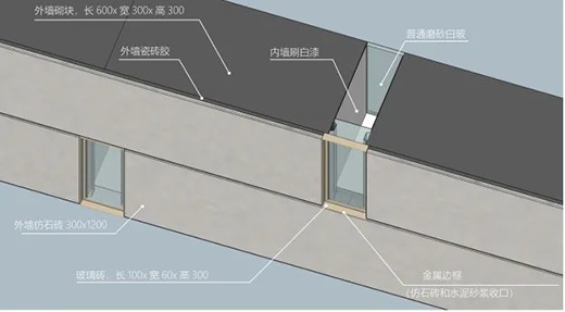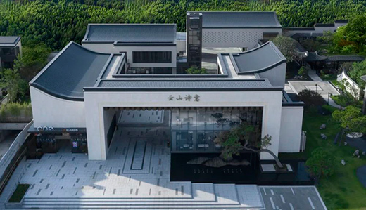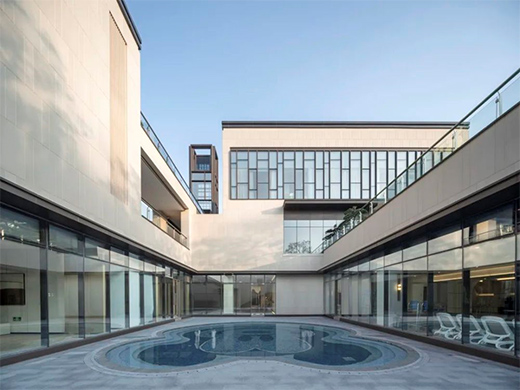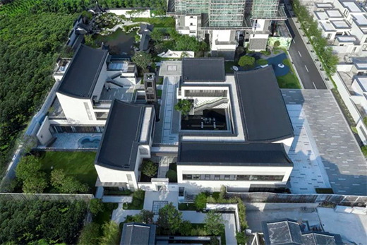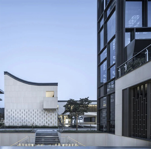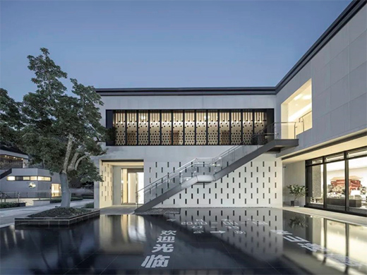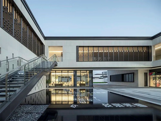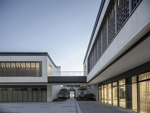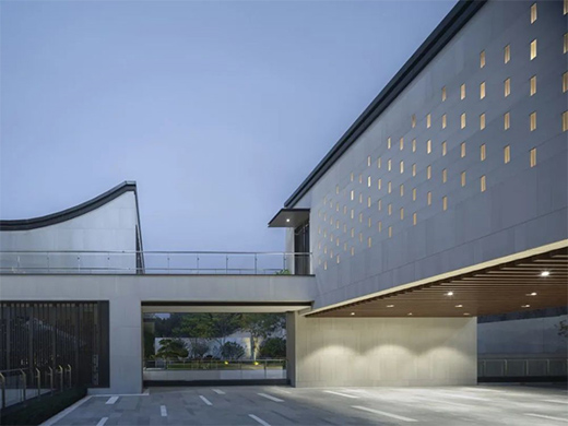 太古則沉悶,太新則無趣,建筑形式如何在中式與現代之間取得平衡,是立面設計的難點。我們將中國傳統的人字坡屋頂進行裁剪,形成具有現代審美特征的非對稱單坡曲面,同時所有屋頂曲面向內呼應“四水歸堂”格局,外側是干凈的現代立面,內側帶有坡屋頂的中式韻味。同時采用金屬屋面,定制鋁合金格柵,仿石磚,玻璃磚等現代的材料組合,形成中式與現代交融的形式語言。