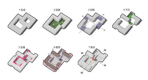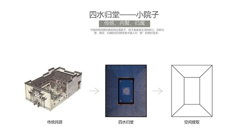 如果說家是小院子,那么鄰里中心作為社區交往的核心就是一個大院子。超市、健身、影音、書吧等現代生活需求的引入,成為設計的切入點,將院空間進行連通切割,打破原有的封閉形式,結合交通流線向社區打開,重塑形成開放、共享、活力的社區交往空間。