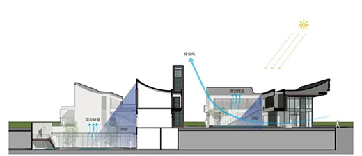 建筑要融入環境,成為我們生活的一部分,適應地域氣候是非常重要的。本項目地處華南地區,是典型的夏熱冬暖亞熱帶氣候,因此設計中借鑒了傳統嶺南地區建筑降溫的方法,一方面通過設置架空層,利用空氣對流帶走輻射熱;另一方面在院落中設計水池,利用水的蒸騰作用吸收直射熱,同時利用建筑陰影降低溫度形成冷院,改善鄰里中心的環境微氣候。