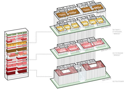 每一層“建筑托盤”都有不同數量和組合的“箱型法庭”?!敖ㄖ斜P”主要設有兩種高度——雙容量與單容量——以適合不同大小法庭的需要。由于高度與法庭數量的不同,各層園景露臺的設計也各有千秋。所有托盤均不設外部玻璃幕墻。