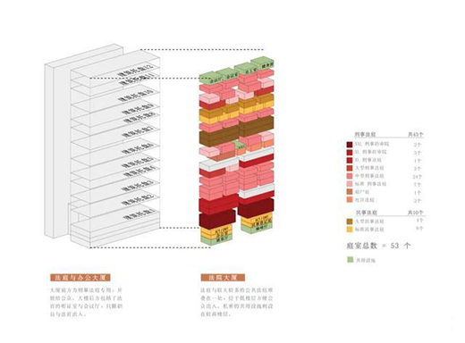 兩座大樓的簡化設計為法院內部提供更簡易明確的組織構圖。所有主要法院審訊功能的單位都設在 “法院大樓” 內,這包括法庭、證人室、候審室、法院職員室、展覽廳及公共等候處等;而輔助支持類的單位如法官的聽證室等則設在 “辦公大樓” 內。
