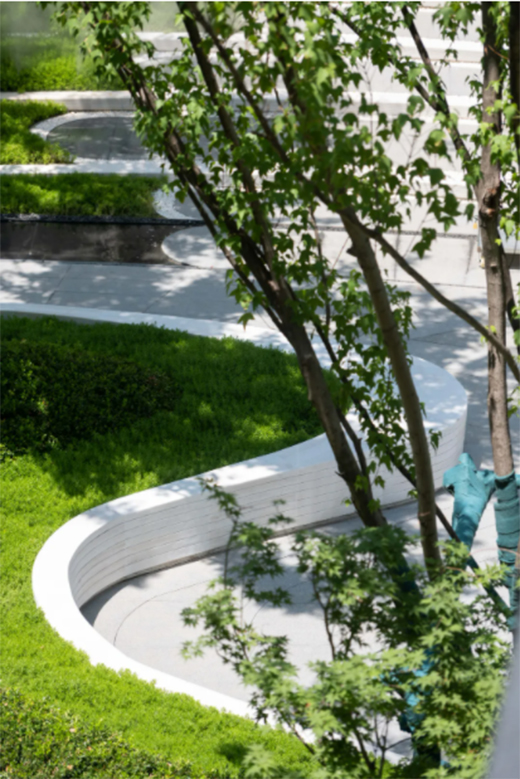 不同于傳統的模塊化組團種植,我們在上層成片栽植相同規格的櫟樹,將人們視線延伸。光影與和風相互交織,成為空間的演奏家。