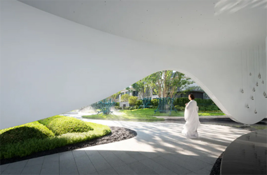 層起跌落的穹頂則好似被撩起的佳人面紗,神秘而引人入勝。綠意,楓林,光影,伴著人徐徐前行。放眼望去一片蔥郁,我們將林、水、光、風、霧等自然元素引入宅間,拾掇草木松石,留出棲息空間。