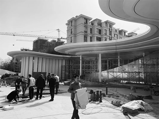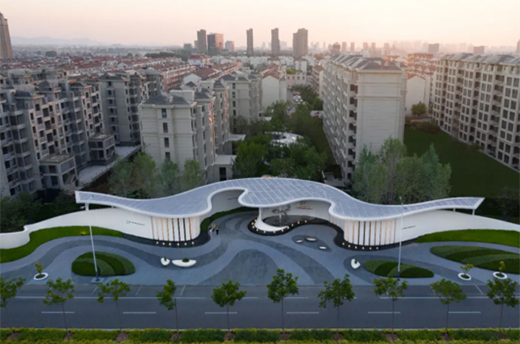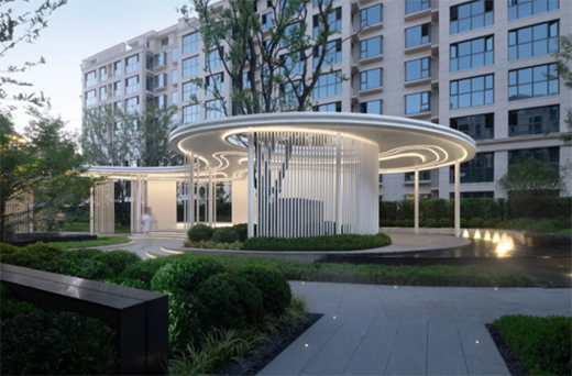 社區入口,如流云般飄舞的水袖建筑造型映入眼簾,簡潔而又流暢,撲面而來的是大氣的古韻。設計的靈感來源于隨風舒卷的云,輕盈、淡泊、夢幻多姿,前場空間開敞舒展,面向著城市界面。若是在小道間隨意漫步,身旁相伴的是那一片片郁郁蔥蔥的柿樹林。
