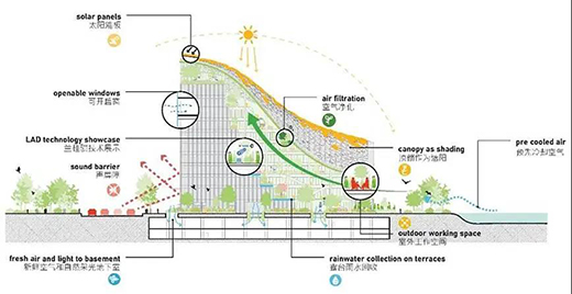這個鋪滿綠植的退臺設計起到了空氣凈化、調節微氣候以及美化環境的作用,也間接為農業生產和公共教育做出了貢獻。