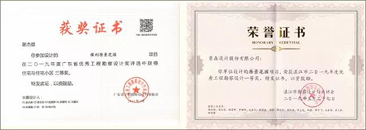 該項目為景森設計公司所設計,在2019年省優和市優評選中,該項目脫穎而出,一舉拿下2019年度廣東省優秀工程勘察設計住宅與住宅小區三等獎以及2019年度湛江市優秀工程勘察設計一等獎。