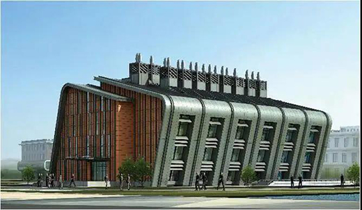 綜合樓四周全是透光玻璃幕墻,在建筑接受陽光直射的東西兩面電池板屋頂下垂布置,一方面可以遮陽吸光發電,另外還可以降低玻璃的眩光度。