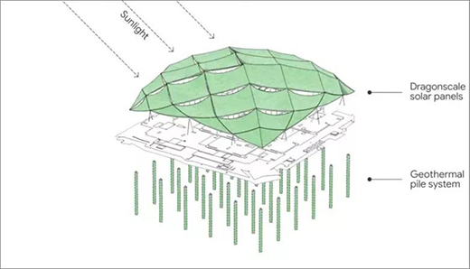 園區計劃于2021年底開放,這是谷歌在新冠疫情導致相關業務關閉后重返辦公室戰略的一部分,通過太陽能電池板和地熱能的融合使這個新園區完全變成零碳建筑,實現園區無碳排放。