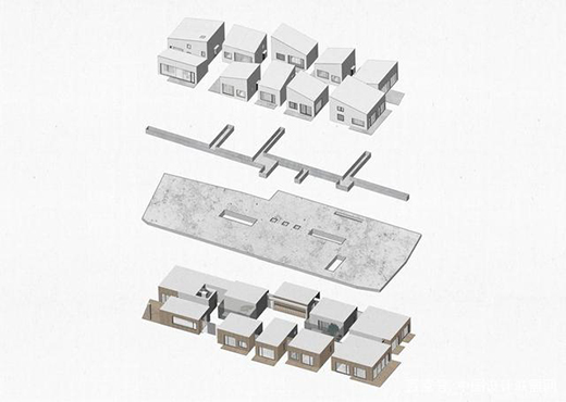 同時我們希望建筑能從傳統(tǒng)水鄉(xiāng)的肌理中生長出來,與自然更加和諧地融合在一起:這樣在功能和面積的前提下,將整體形態(tài)拆分為幾個小尺度的建筑,通過排列由此建立新的秩序。我們將10個單獨的“盒子”串在一起,形成一個巨大的連續(xù)空間。賓館有功能齊全的餐廳、茶室、客房、客房、客棧、客棧主人的私人生活空間。這座建筑是由上下兩層組成,垂直向上,體驗完全不同。一層設有客房和主要功能空間,沿河面布置,保證了每個房間都有良好的景觀,并具有一定的私密性。各功能房間被連接成一個連續(xù)的共享空間。二室內(nèi)設天井和可開啟天窗,滿足室內(nèi)公共空間采光,更能使室內(nèi)公共空間更好的采光,更能使室內(nèi)公共空間更能讓室內(nèi)公共空間采光,使室內(nèi)公共空間更加自然地采光。