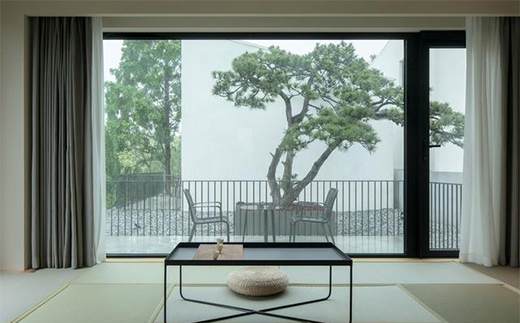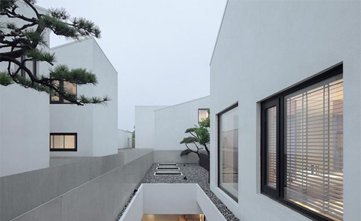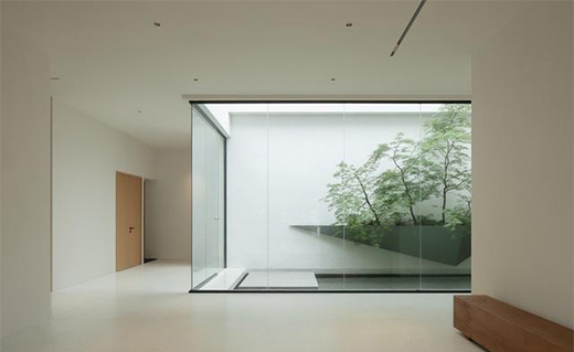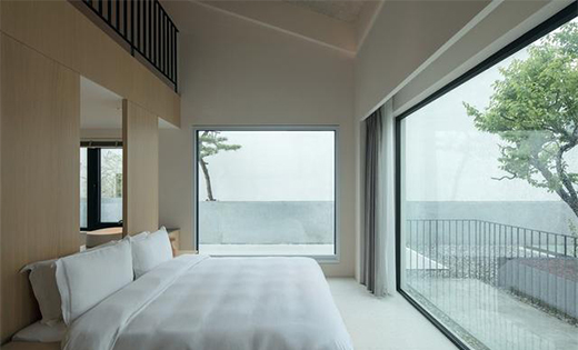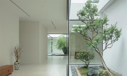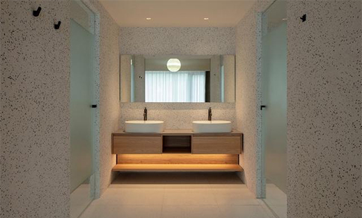 室內(nèi)公共空間部分,整體以白色簡約為主:墻面和天花選用米白紋理涂料,地面為白色水磨石。這種空間,能很好地襯托出天井帶來的光線變化。此外,可滿足公共空間布展的功能要求。公眾開放區(qū)內(nèi),本公司還設置了木質(zhì)固定家具,與植物和活動家具相結合,形成開放式起居室空間。內(nèi)房部分,深色和淺色兩種顏色搭配。材料選用同一種材料:地面為水磨石,墻面及天花采用肌理涂料。對于沙發(fā)區(qū)域、臥室區(qū)域、辦公室區(qū)域選用較為柔和自然的木飾面材料。在淋浴區(qū)域選擇以小顆粒為底料的水洗石,不僅增加了空間的肌理質(zhì)感,而且起到很好的防滑效果。