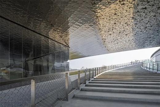 架空頂面覆蓋鏡面波紋板,金屬反射將波光粼粼的湖面、連綿的群山均吸收映射在此,山、水、建筑就此融為一體。