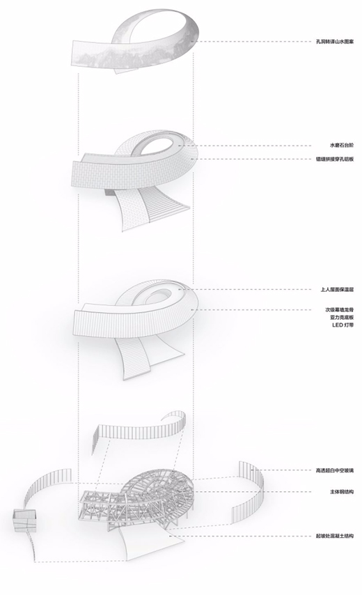建筑從地面自然生長而起,一氣呵成,以盤旋上升的姿態(tài)化作遠處巍峨山勢的延續(xù),以舒展的曲線造型回應群山環(huán)抱的自然環(huán)境,同時巧妙地化解場地高差,順勢連接東西兩側的公共空間。