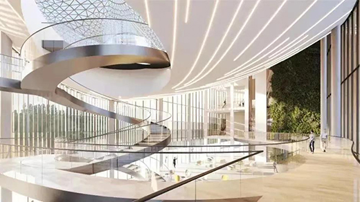 建筑地上4層,地下1層,高24m,由南北2個體塊和中央大廳組成。兩側體塊結構上形成錨點,屋頂造型采用側拉結構,創造開闊的挑空大廳。