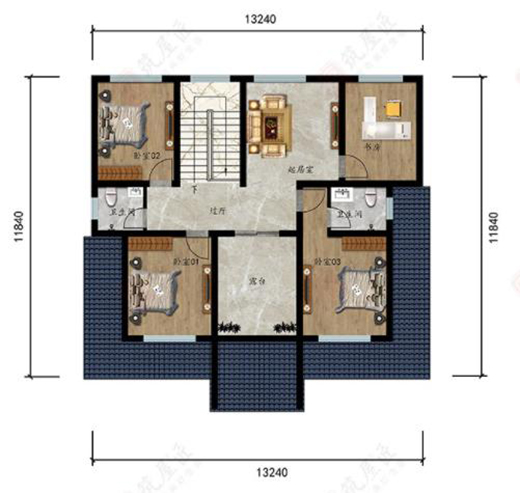 二層主要是休息區,規劃了3個臥室、書房、起居廳和大露臺,主臥套間滿足現代品質生活,其他功能區滿足人們的學習娛樂需求,非常舒適。