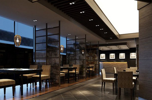 考慮到空間小這一因素,我們可以通過吊頂或者地板高度材質(zhì)的不同來分隔空間,卡座與卡座之間可以用一些裝飾物來遮擋,這樣在視覺上會顯得較為開闊,長型餐桌可以靠墻放置,讓走道更為寬敞,以此來造成空間增大的效果。