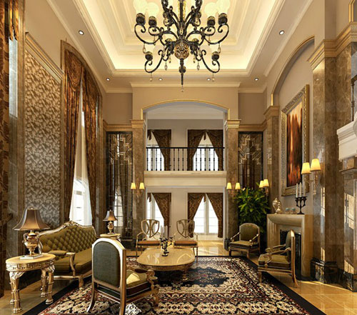 別墅的空間客廳較大,是室內重要的休閑場所,也是最突顯整體設計風格的地方,因而在設計上,設計師需要對客廳空間整體和局部的把控。別墅的層高相較于普通的住宅要高,此處在設計上一般都考慮增加輔助照明、燈光處理、墻面修飾、欄板形式和選材等手法來豐滿別墅的空間感。