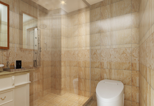 復古暖黃鋪陳的衛生間里,墻腰以繾綣花紋裝飾,上下墻磚色調形成深淺相映,打破墻面的單調感。拐角處用清透玻璃規劃出淋浴區,實現空間的干濕分離。