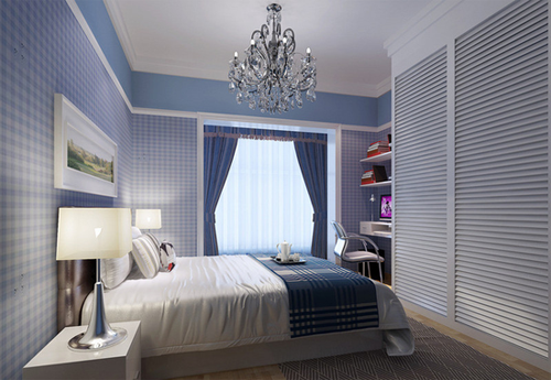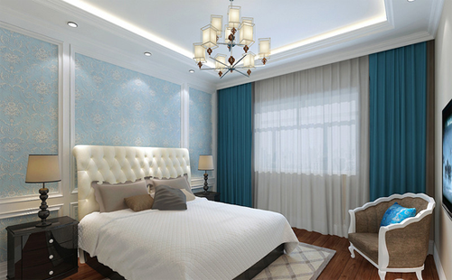臥室延續了輕盈浪漫的氛圍,淺藍色背景墻上歐式印花柔美親和,與湖藍色窗簾形成鮮明的深淺對比,在白色與土黃色的搭配下,空間彰顯出質感優雅的生活狀態。