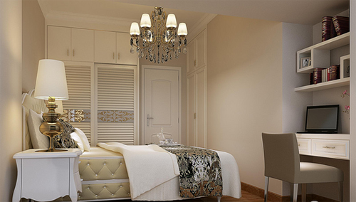 淺米黃色的臥室里,衣柜采用嵌入墻體式,釋放出水平面空間。歐式拉扣雙人床上,花色床旗與吊燈形成呼應。學習區利用墻面采用擱架式打造,合理利用空間。