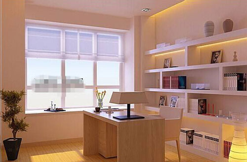雖然是利用房間角落的小書房,也要注意照明與采光,作為讀書寫字的場(chǎng)所,對(duì)于照明和采光的要求很高,所以工作臺(tái)最好放在陽(yáng)光充足但不直射的窗邊,電腦屏幕反光問題便解決了,在工作疲倦時(shí)還可憑窗遠(yuǎn)眺一下以休息眼睛。書房?jī)?nèi)一定要設(shè)有臺(tái)燈和書柜用射燈,便于主人閱讀和查找書籍。但注意臺(tái)燈要光線均勻地照射在讀書寫字的地方,不宜離人太近,以免強(qiáng)光刺眼。長(zhǎng)臂臺(tái)燈特別適合書房照明。