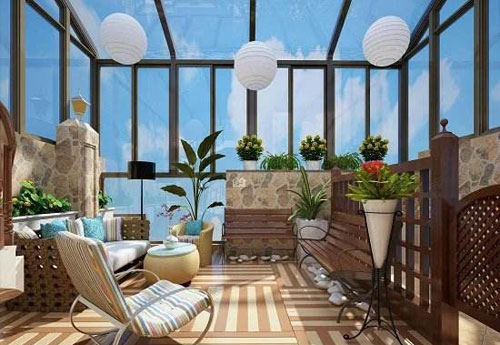 通風、透氣、采光、納涼、曬衣、曬物等,自然是陽臺的一些功能。但除了這些外,盆栽花草,把生活點綴得更美,也是陽臺不可忽視的重要潛在功能。為了防止仲夏時節陽光的照射,可以利用比較堅實的紡織品做成遮陽篷,遮陽篷本身不但具有裝飾作用,還可遮擋風雨。遮陽篷也可用竹簾、窗簾來制作。遮陽篷應該做成可以上下卷動的或可伸縮的,以便按需要調節陽光照射的面積、部位和角度。同時也能使陽臺一側的房間免于強烈的照曬,形成室內工作、休息的舒適環境。供休息、餐飲使用的陽臺,少量的家具還是必要的。由于陽臺的面積和承重量都有限度,因此,陽臺上的家具宜選用輕便型的折疊家具。陽臺是最適合家庭養植各種花草的地方,盆栽植物可置于陽臺欄板上,但應注意安全,要加設護欄,以免花盆墜落傷人。也可設置垂直的繩索、塑料管線等,種植葡萄、爬山虎等具有攀緣性能的植物,一方面美化了陽臺,又可在盛夏季節起到遮擋陽光的作用。除綠色植物、花卉等能起到裝飾陽臺的作用外,陽臺側墻面、地面也是裝飾美化的重點。例如,可在整齊有致的側墻上掛置富有裝飾韻味的陶瓷壁掛、掛盤、雕塑等裝飾品,有的隔墻還可做成博古架的形式,以供放置裝飾器物。在平滑素雅的墻面上,也可掛置用柴、草、葦、棕、麻、玉米皮等材料做成的編織物作為裝飾品,陽臺的地面可利用舊地毯或其他材料鋪飾,以增添行走時的舒適感。